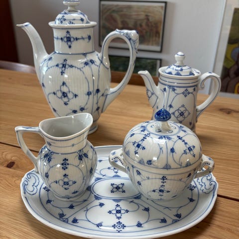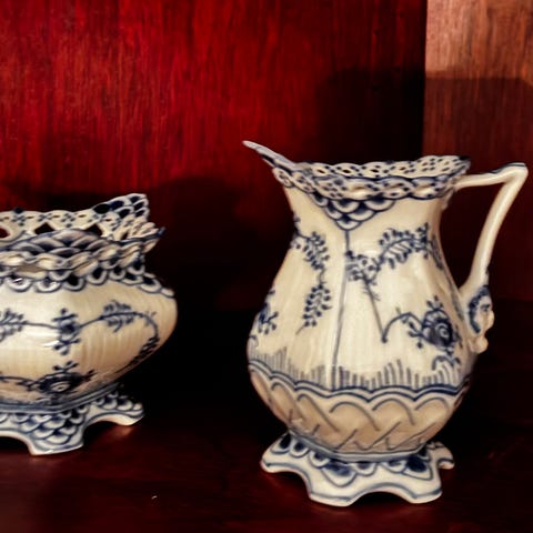 Tysk Musselmalet sukker- og flødekande i porcelæn med blå mønster og sølvplet detaljer.