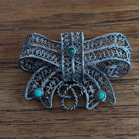 Sølv filigran broche med rød sten. Mål ca. 3 x 3 cm.