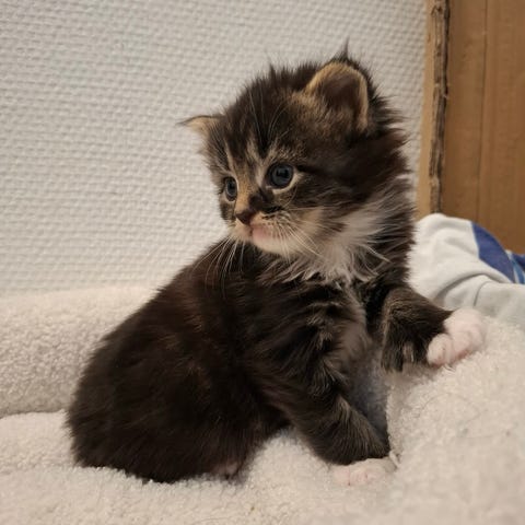 Mor er mix af norsk skovkat, maine coon og hellig birma. Den formodede far er maine coon blanding.