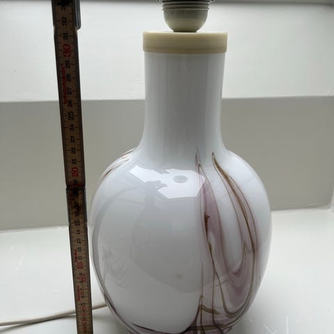 Selve lampen (glasset) er 23,5 cm høj og 46, 5 cm med stativ. Fatningsdelen sidder lidt løst, men det kan nemt fikses med en klat lim.