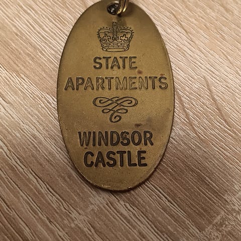 Dankalk nøglering i metal med rund hvid emalje og sort tekst. Nøgleringen har en karabinlås og en rund ring til nøgler. Total længde cirka 7 cm.