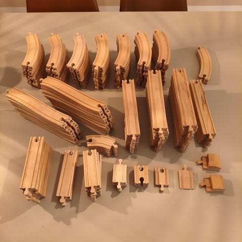 IKEA togbane i træ. Sættet indeholder lige og buede skinner.