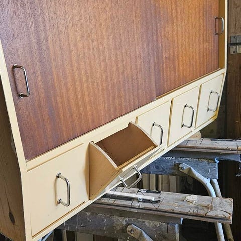 Gammeldags overskab med skrå skydelåger.