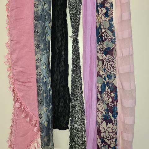 Lækre tørklæder i farven lilla, grøn og råhvid. 50 kr stk.