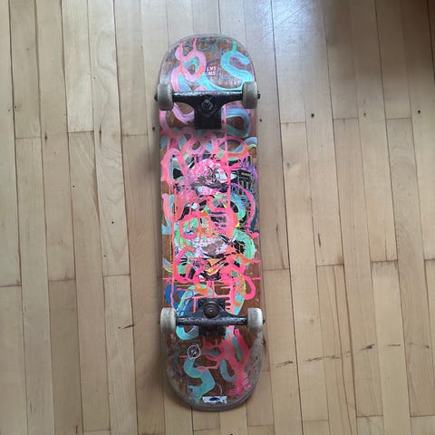 Skateboard med farverigt mønster på undersiden. Brætets overflade er sort med gribemateriale. Hjul og trucks er monteret, skateboardet er klar til brug.