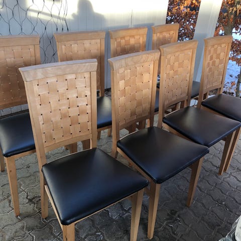 Skovby stole i sæbebehandlet bøg med flot flet ryg og sort ægte læder på sæder.