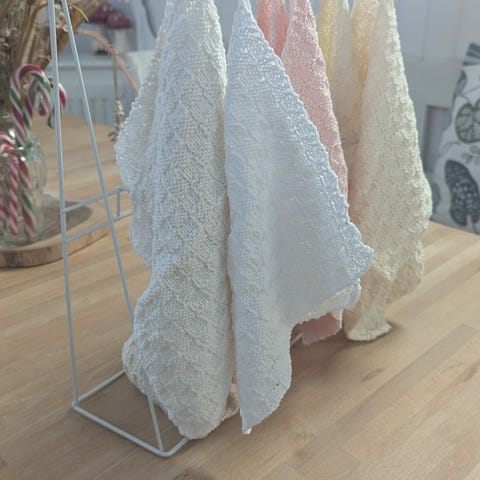 Nylavede små gæstehåndklæder med den fineste lille hæklede kant, til at lægge i en kurv på badeværelset/køkkenet ect.