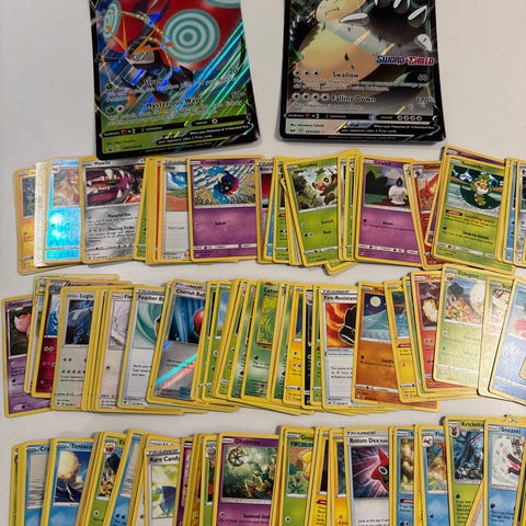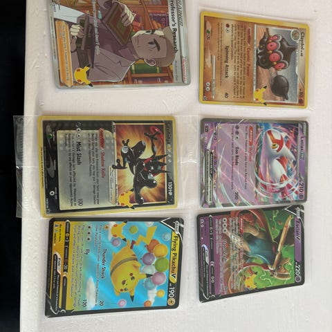 Samling af Pokémon-kort med forskellige figurer og angreb. Kortene inkluderer karakterer som Ninetales, Charcadet, Victini, og flere.