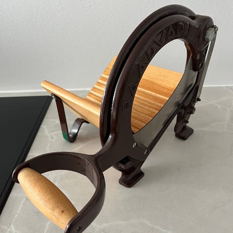 Original Raadvad brødskærer i rødmalet støbejern med træhåndtag og træbræt. En ikonisk og solid køkkenklassiker, kendt for sin høje kvalitet og lange levetid.