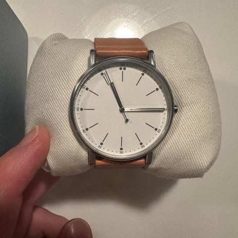 Skagen Kvinde ur med hvid urskive og mesh-rem i metal. Uret har en rund urskive med minimalistisk design og guldfarvet urkasse. Mesh-remmen har justerbar lukning.