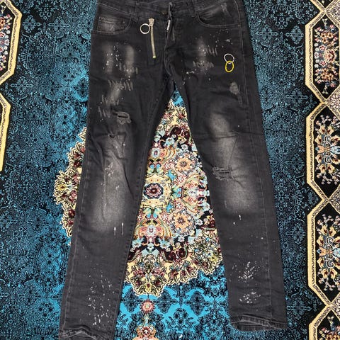 Sælger et par Dsquared2 jeans med det ikoniske, look og fede detaljer. Klassisk mørk denim med distressed huller, paint splatter-effekt og flot farve som giver et eksklusivt og clean udtryk.