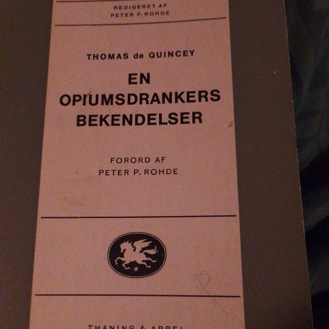 Thomas De Quincey En Engelsk Opiumbrugers Bekendelser bog med titlen Suspiria De Profundis Den Engelske Postvogn. Teksten er på dansk og indeholder forfatterens bekendelser og essays.
