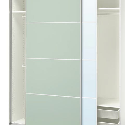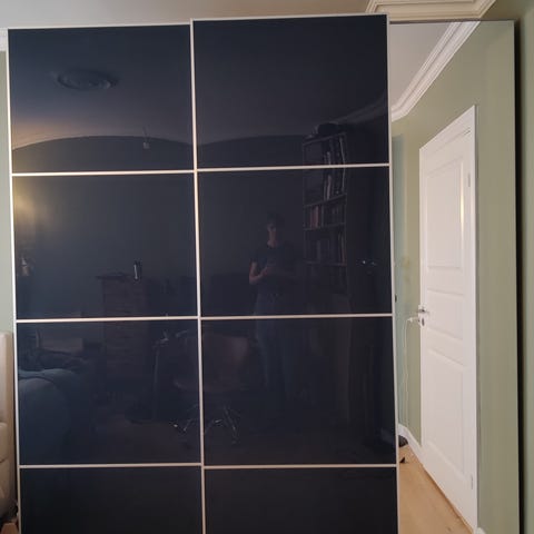 Ikea Pax garderobeskab med skydedøre, den er brugt, og der kan ses spor, se sidste billed, men ellers fungerer den hel fin er er meget flot