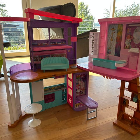 Barbie Dukkehus legetøj i farverne pink, lilla og turkis. Indeholder flere etager, møbler og tilbehør som rutsjebane, bord med stole, badekar og toilet. Egnet til børn til leg og kreativ udfoldelse.