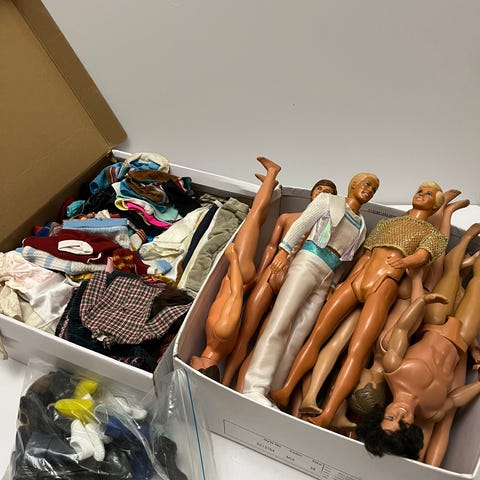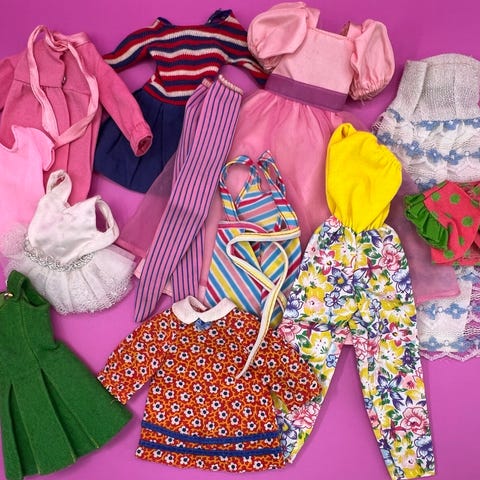 Barbie/Skipper/Ken dukketøj sæt med forskellige styles og farver, herunder kjoler, nederdele, bukser, jakker og bluser. Sættet indeholder beklædningsgenstande i flere materialer og designs. Noget af tøjet trænger til lidt reparation. Retro