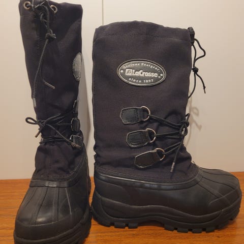 Støvlerne har en kombination af læder og gummi med snørelukning foran. De er designet til vinterbrug med en foret inderside for ekstra varme og isolering. Sålene har et mønster, der giver godt fodfæste på glatte overflader.