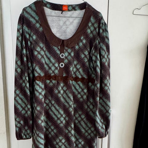 Den er ca. 87 cm. lang fra nakke og til nederst på kjolen.
