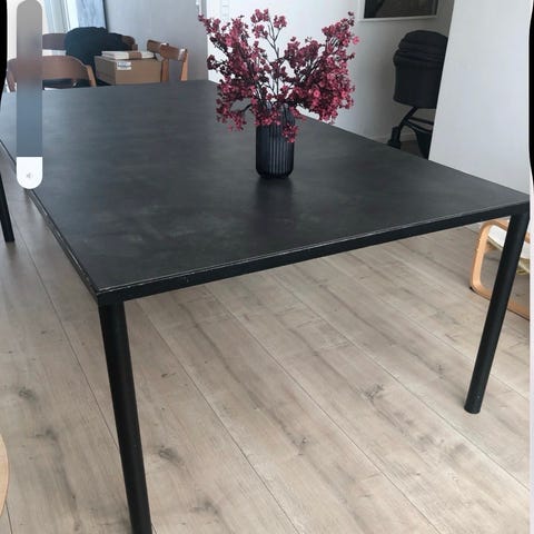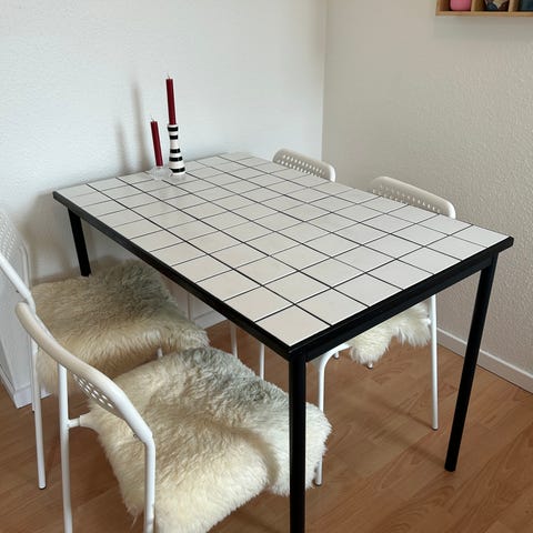 Lyseblåt spisebord med klinker fra Italien, hvid fuge og sorte jernben (disse kan skiftes).