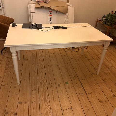Flot hvidt bord, er lidt slidt på toppen så den kunne godt bruge en omgang slibning og maling men eller meget flot.