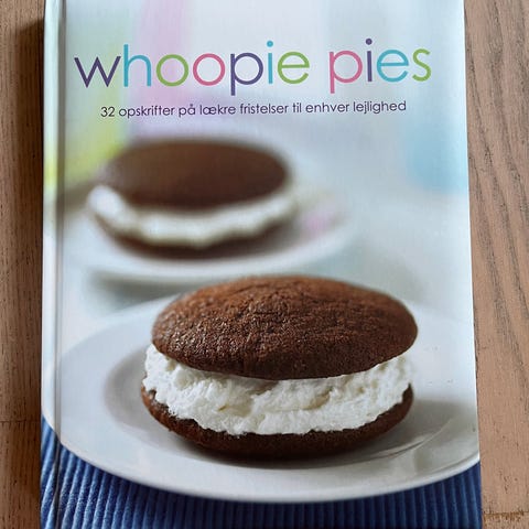 Whoopie Pies kagebog med opskrifter på 32 forskellige whoopie pies. Indeholder instruktioner til bagning af kager med fyld, herunder forskellige smagsvarianter og teknikker.