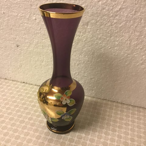 Grøn glasvase guldbelagt med farvet blomster pynt måler ca.20cm.Sender