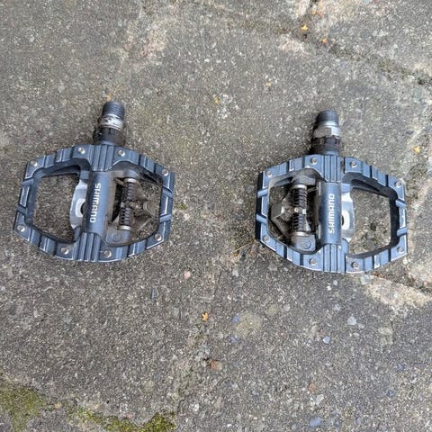 Pedalerne har brugsspor og kosmetisk slid, som ses på billederne, men er mekanisk intakte og fungerer som de skal. Gevind og justeringer er fine.