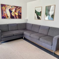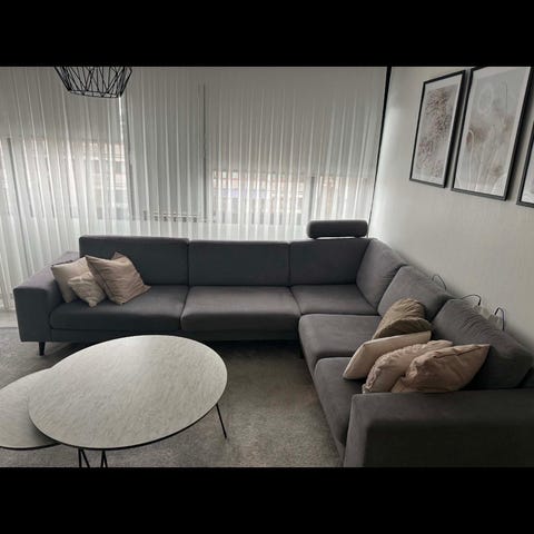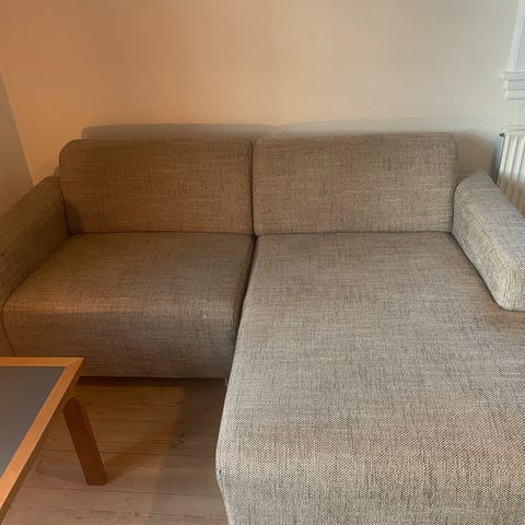 Grå hjørnesofa til 2 personer Max 3. Betrækket er skiftet men har et lille hul som kan ses på billede 2. Skal afhentes