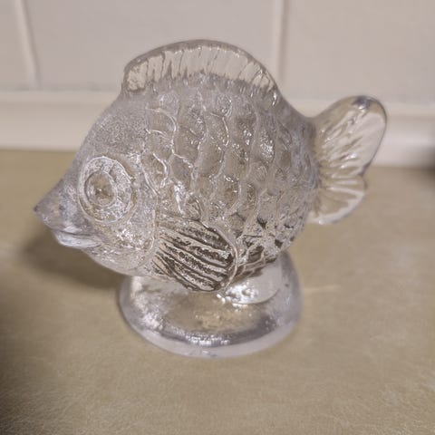 Glaskunst formet som en fisk. Lavet med ægte sandbund.