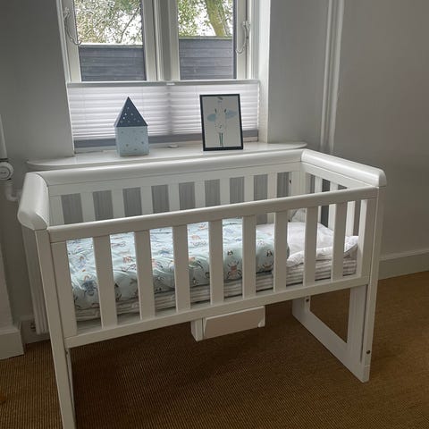 Troll Bedside Crib i hvidt træ. Designet til at placeres ved siden af sengen for nem adgang til barnet. Passer til små børn og kan bruges som en praktisk løsning til tæt på forældre under søvn.