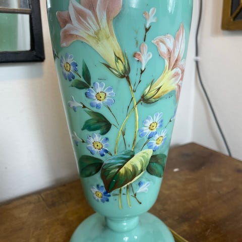 Meget smuk gammel opaline lampe / lampe i opalineglas / bordlampe med håndmalet motiv. Helt unik. Lampeskærmen kan medfølge gratis, men desværre ikke det løse stativ til at holde selve lampeskærmen.