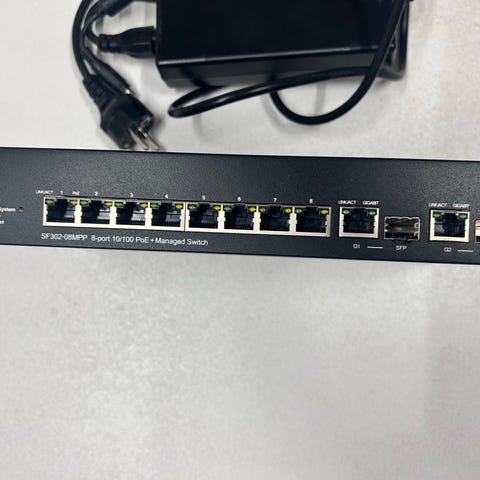 Cisco SF302-08P netværksswitch med 8 porte.