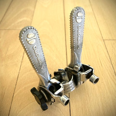 Originale Shimano Dura-Ace downtube gearskiftere i klassisk vintage-udgave.