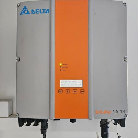 Delta Solivia 3.0 TR solcelleinverter med modelnummer SOLIVIA3.0TR. Inverteren har en AC nominel effekt på 3000 W og en DC nominel effekt på 3000W. Den er designet til 1-faset AC-udgang med en nominell spænding på 230 V og en nominell strøm på 13 A. DC-indgangsspænding varierer fra 120 V til 550 V, med en maksimal indgangsstrøm på 10 A pr. MPPT. Inverteren har to MPPT-spor og en maksimal effektivitet på 97,6 %. Den er udstyret med 4liniers LCD-skærm til visning af status og indstillinger. Serienummer: 220287101305001381.