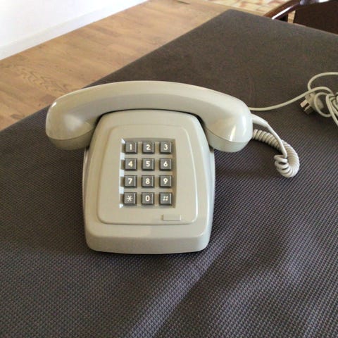 Klassisk vintage Kirk F51 fastnet bordtelefon i beige bakelit fra 1960’erne