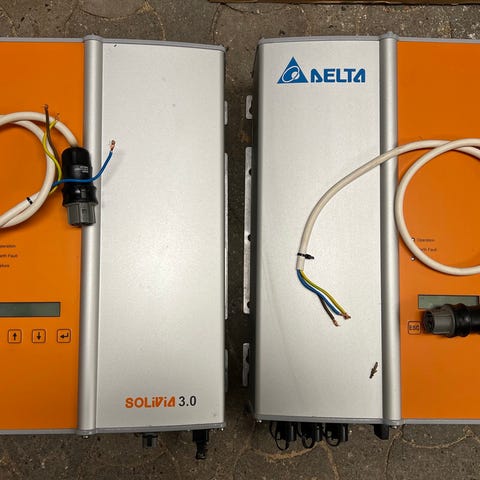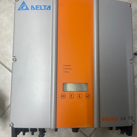 Delta Solivia 3.0 solcelleinverter med modelnummer SOLIVIA3.0. Inverteren har en AC nominel effekt på 3000 W og en DC nominel effekt på 3000 W. Den er designet til 1-faset AC-udgang med en nominell spænding på 230 V og en nominell strøm på 13 A. DC-indgangsspænding varierer fra 120 V til 550 V, med en maksimal indgangsstrøm på 10 A pr. MPPT. Inverteren har to MPPT-spor og en maksimal effektivitet på 97,6 %. Den er udstyret med 2 liniers LCD-skærm til visning af status og indstillinger.