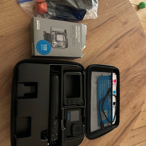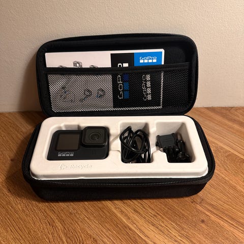 Næsten ikke brugt og med ekstra udstyr: kamera case med mikrofonhætte, stativ, selfiestang, chest strap, monteringsklemme, fjernbetjening, usb ladekabel, original taske med lynlås og fire batterier.