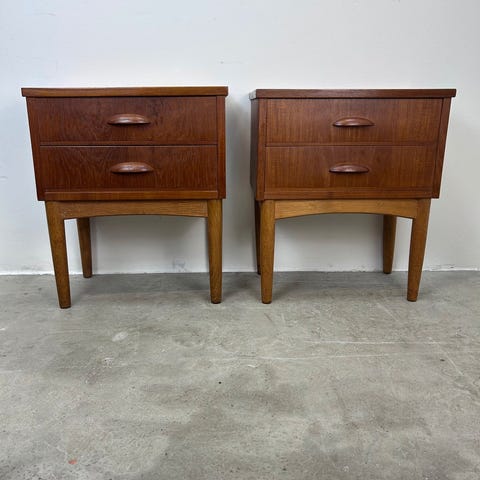 sengebord/entre kommode med underliggende skuffe i fineret teak opsat på udvendigt stel af bøg