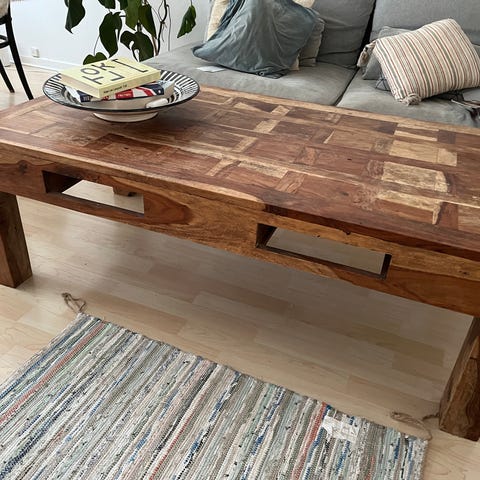 Træbord med hulmønster på bordpladen. Bordet har en rektangulær form og er lavet af lyst træ. Velegnet til sofabord