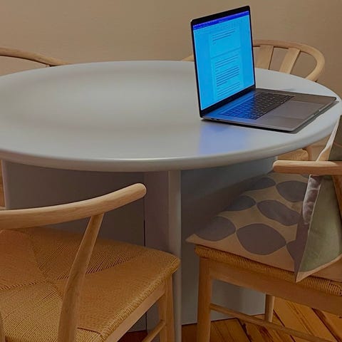 Mørkeblåt spisebord med 100 cm i diameter. Kun 1 år gammelt. Der kan sidde 4-5 personer rundt om. Nypris er 4.500 kr.