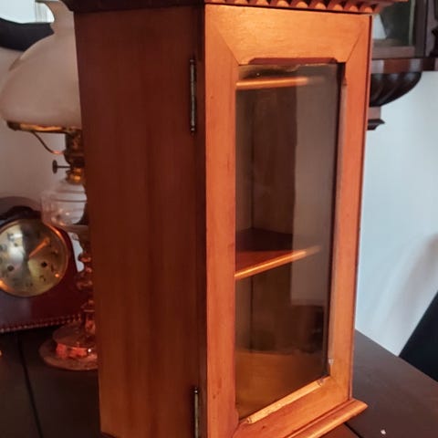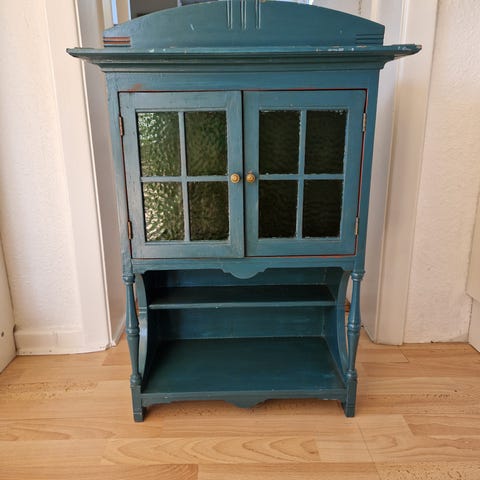 Sælger dette fine, lille hængeskab med historie. Det har tilhørt min mormor og er sandsynligvis fra 1950'erne. Skabet er udført i træ og har en smuk, håndmalet finish i afdæmpede grønne og gule farver med fine rustikke detaljer.