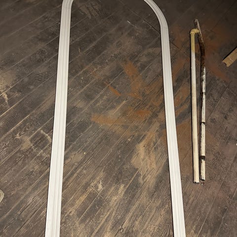 Ramme består af flere dele inklusive en buet topsektion og lige sider. Velegnet til brug som dekorativ eller funktionel ramme til døre eller vinduer.