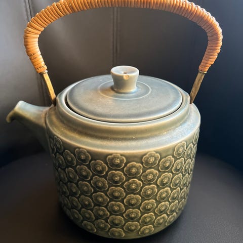 Fin rød emaljekande med intakt flet på hanken. 23cm høj. Stempel i bunden. Der er lidt afslag på indersiden ved hanken - men ellers i rigtig fin stand. Se fotos. Sender gerne.