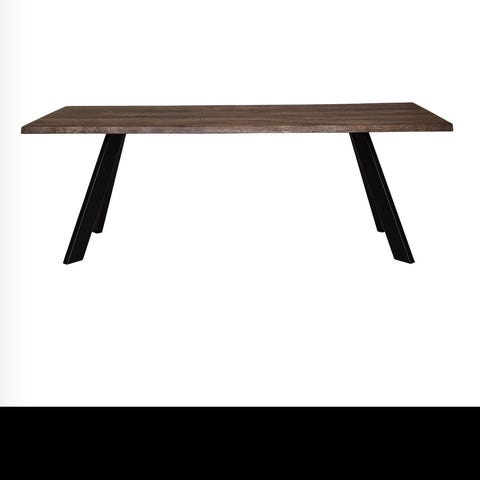 Flot spisebord af 100% FSC-certificeret eg, med sorte jern ben og dynamisk form. Bordet er behandlet med klar olie og er godt modstandsdygtigt. Et meget robust bord. Kan slibes da det er massivt træ. Der kan fint både stå 4 og 6 stole om det. Nypris var 8700 og sælges nu til over 10.000 hos fx. Bekko.dk