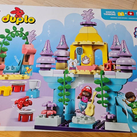 LEGO DUPLO Disney Ariel Undervands Slot legetøj med farverige byggeklodser, designet til små børn. Sættet indeholder elementer, der forestiller et slot under vandet, med figurer og tilbehør inspireret af Disney's Ariel. Velegnet til kreativ leg og udvikling af finmotorik.