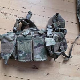 Selve chesty-harness brugt og der er lidt kosmetiske delamineringer som ikke betyder det store, når man har det på. Dope pouch-kopi fra et ukendt mærke i multicam med lynlåslomme og double 5.56 + pistol/multitool inserts af elastikvarianten