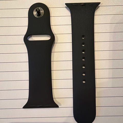 Apple Watch rem i sort silikone, designet til Apple Watch. Remmen er justerbar med flere huller for pasform og lavet af blød silikone, der sikrer komfort ved brug.