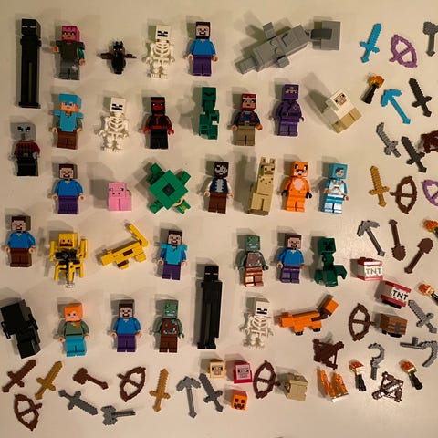 LEGO Minecraft figurer og tilbehør, inklusive forskellige karakterer og redskaber som våben og værktøj. Sættet indeholder diverse små dele og tilbehør, der kan bruges til at bygge og lege med Minecraft-temaet.