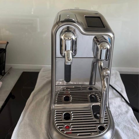 Sælger Nespressos topmodel af kapselmaskiner i modellen Creatista Pro med touchskærm. Designet er i rustfrit stål og den kan bl.a. lave espresso, latte og flat white ved hjælp af automatisk mælkeskummer.