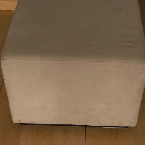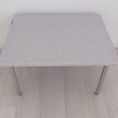 Den ene stol har en plet, som kan fjernes i vask. (Stof kan aftages). Bordet har et lille hak i siden.