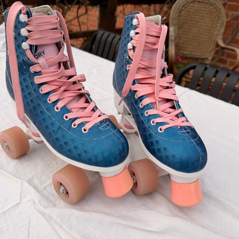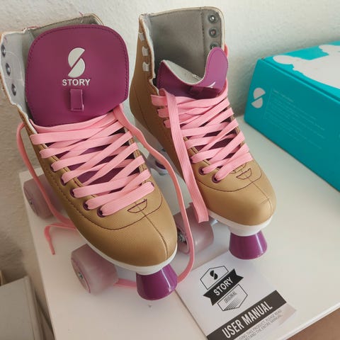 Story rulleskøjter i størrelse 39 med lilla og lyserøde farver. Designet til rulleskøjtning med klassisk støvle og fire hjul. De er brugt max 3 gange.